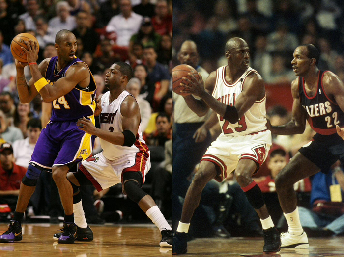 说科比像乔丹,还得分个阶段。早期的科比,是形似——不止技术动作,举手投足也像;后来的科比,越来越是神似——反复雕琢技艺直至无解,场上的那份偏执与骨子里的热烈。