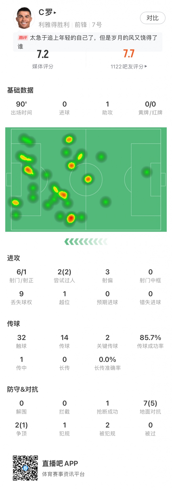C罗本场比赛首发出战90分钟,贡献一次助攻。